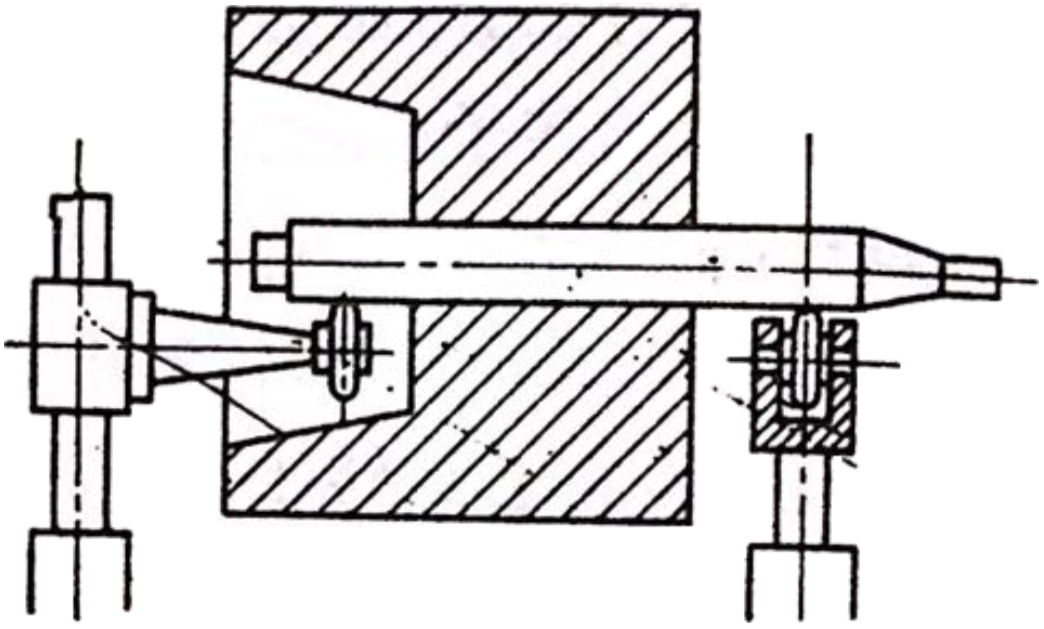 那么我們?cè)诳紤]上述事項(xiàng)的基礎(chǔ)上,先要選擇適合各轉(zhuǎn)子的通用平衡機(jī),那么對(duì)于標(biāo)準(zhǔn)型通用平衡機(jī)不適用的轉(zhuǎn)子來(lái)講,大部份的情況是,或者在通用型的平衡機(jī)上附件,或僅做局部改動(dòng)使用通用平衡機(jī)。如圖所示的轉(zhuǎn)子,如果不加處理的話,就沒(méi)辦法裝在通用平衡機(jī)上,如果準(zhǔn)備好特殊懸臂滾子支承,那么這樣的問(wèn)題就能解決了,與此相同的例子為數(shù)不少。